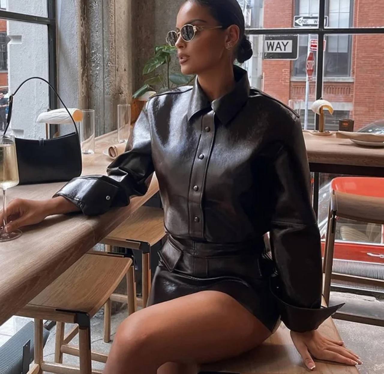 Elevate your style with this sleek two-piece set! Featuring a single-breasted leather jacket with a classic turn-down collar and a high-waist mini skirt, this outfit blends elegance and edge.